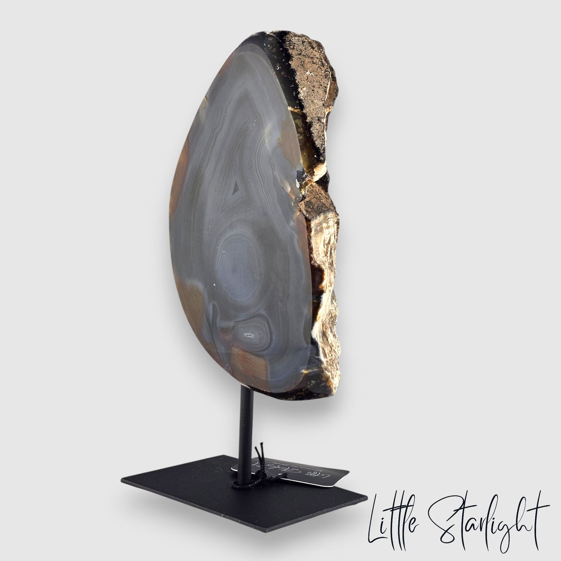 Deze exclusieve agaat op standaard, afkomstig uit Soledade, combineert de robuuste pracht van de natuur met verfijnde kunst. Met zijn prachtige patronen en diepe kleuren is het een opvallend element dat elke ruimte verrijkt met zijn serene en aardse uitstraling.
